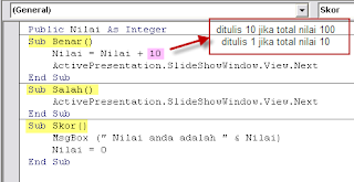 Save –> Save as type –> PowerPoint Macro-Enabled Presentation (*.pptm ) –>save. Setelah disimpan silahkan diujicoba dahulu. Demikian uraian singkat tips dan trik mudah membuat penskoran untuk evaluasi dengan Microsoft PowerPoint. Semoga bermanfaat!